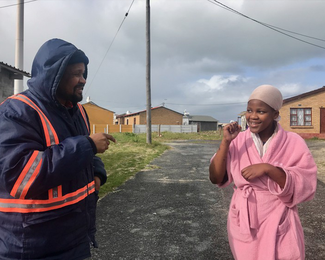 Photo caption: Lindokuhle interpreting for her deaf father, Khayalethu Mcuukelwa, who was lucky enough to have his house built before the land occupation took over plots reserved for deaf housing beneficiaries. Photo: Tariro Washinyira
